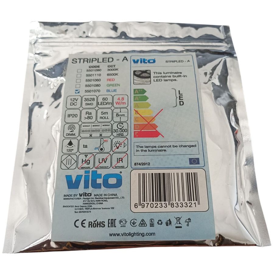 Striscia LED verde Vito 5501080 con 60 diodi per metro lineare tipo SMD3528 e potenza 4,8 W/m.