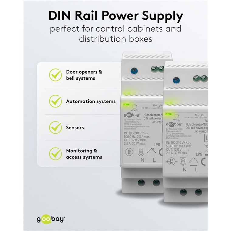L'alimentatore per guida DIN è la soluzione ideale per i dispositivi che devono essere sempre pronti all'uso e che richiedono un'alimentazione stabile di tensione continua (CV), ad es. campanelli, sistemi di accesso o sensori. Grazie al suo design compatto e a gradini, l'alimentatore è perfetto per ambienti ristretti con requisiti termici esigenti, ad es. in armadi di controllo o scatole di distribuzione.