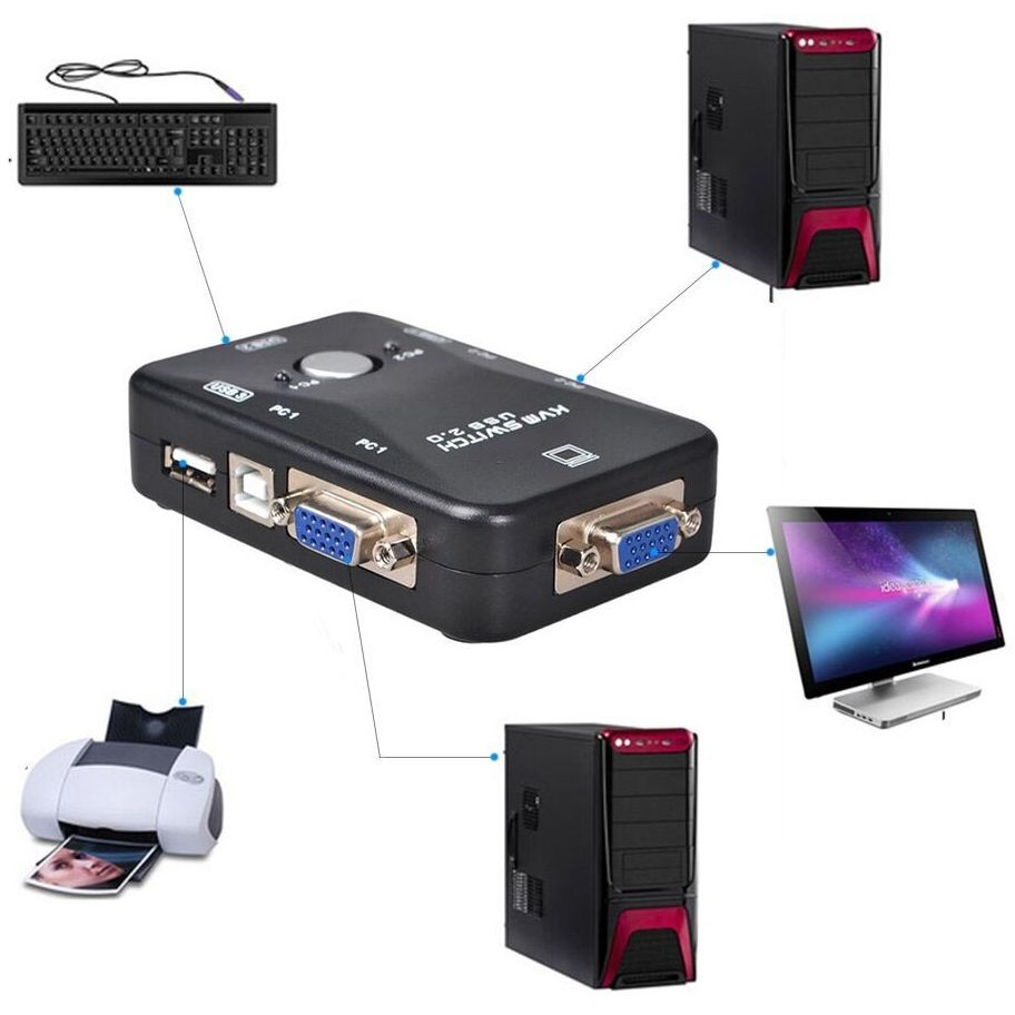 - Switch between computers by pressing a button on the KVM switch, max resolution 1920*1440.