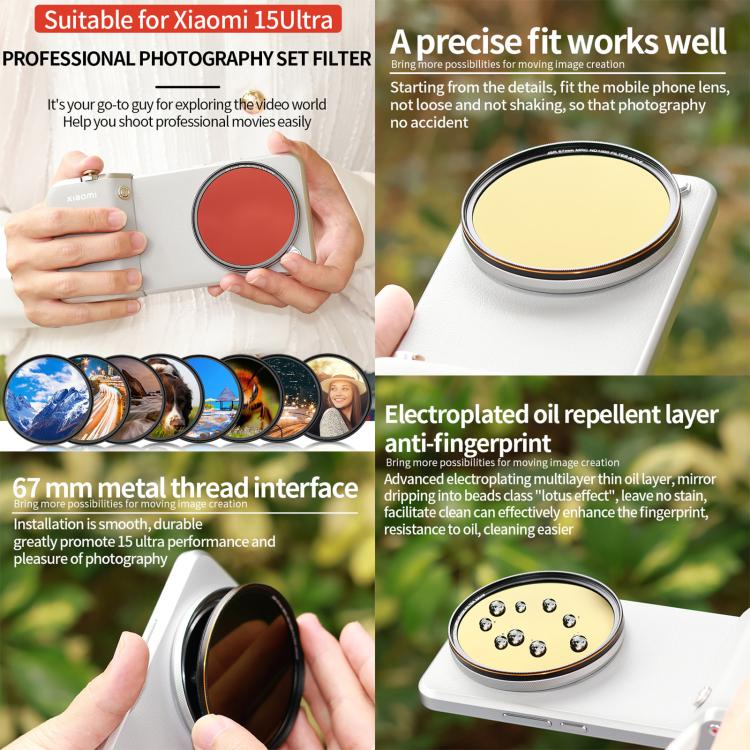 Il filtro si installa tramite interfaccia filettata in metallo da 67 mm, assicurando un fissaggio stabile e preciso sull’obiettivo dello smartphone. È utile anche come protezione aggiuntiva per la lente, aiutando a difenderla da polvere e graffi durante l’utilizzo quotidiano o in esterno.